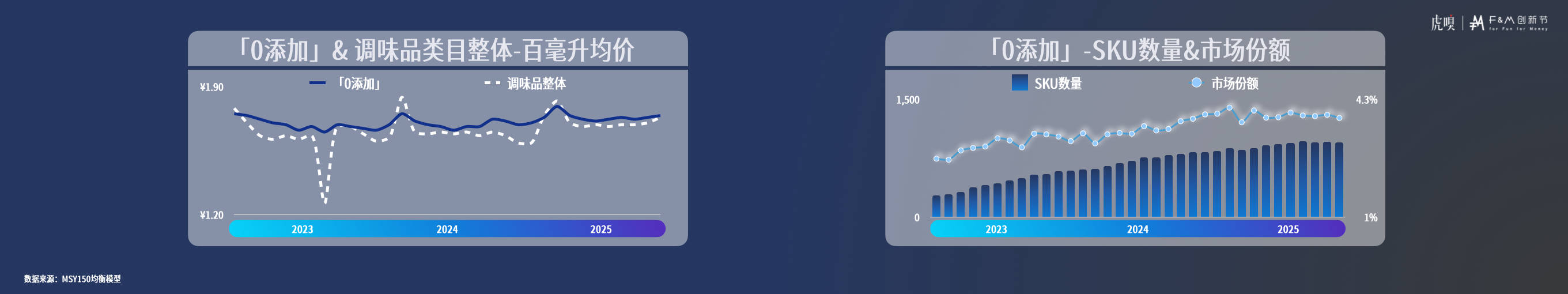 从数据可以看到,零添加产品的均价在过去确实比类目整体的均价稍微高一点点,但现在也开始趋同,或许可以说明概念所能够带来的溢价正在消退。每个类目都需要新概念来驱动增长,所以2025年3月之前,零添加调味品的SKU数量和市场份额都在快速增长,但其实在3月以后,可以看到,份额已经有着比较明显的掉头向下的趋势,SKU数量也不再快速增长,甚至将在未来随着法规的临近逐渐下滑。