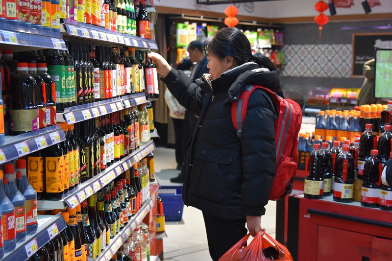 “老板,买2瓶酱油、2瓶香醋、1斤花椒面、1包味精。”新河村群众孙洪军拿着手里的年货单子,在农贸市场食品配料摊购买过年所需要的作料。