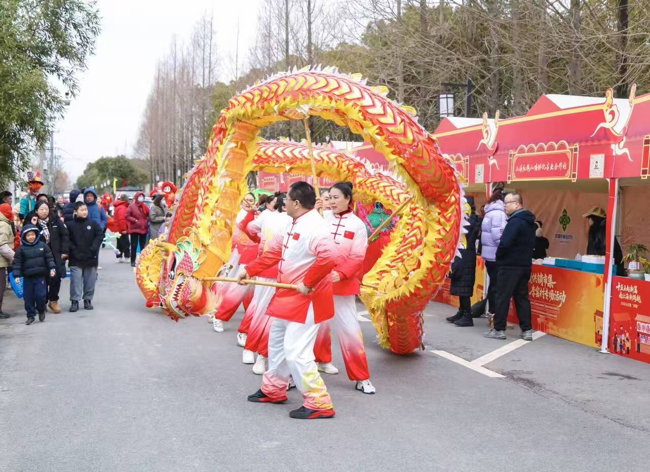 下午1点半,随着舞龙舞狮、蚌壳精、摇船鱼灯、花轿等民俗行街表演沿着村道缓缓行进,现场气氛被推向高潮。观众们纷纷举起手机记录这充满江南韵味的瞬间,与此同时,魔术、泡泡秀、扔瓶子等街头艺人在市集区的即兴互动也引来了阵阵欢笑。